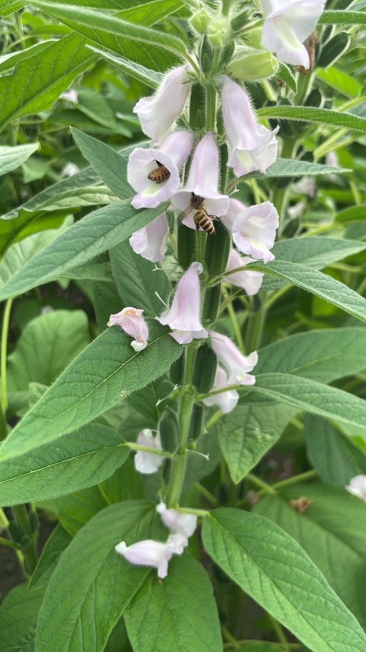 私たちが一生懸命育てたごまの花の蜜を美味しそうに吸っているミツバチを見て、少し癒されました。