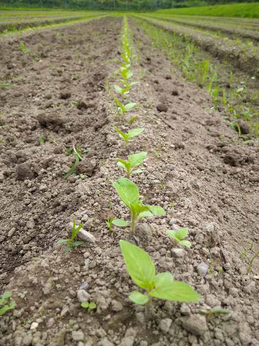 上の写真は私たちが担当しているごまの畝での除草作業と再播種の様子です。