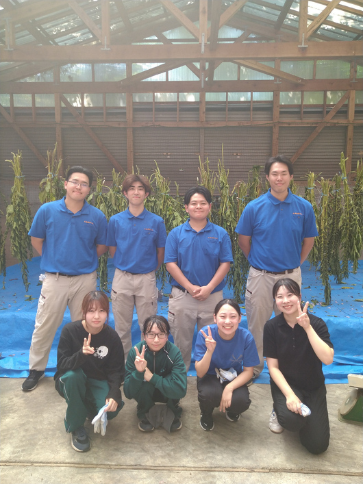 2025年入社の新入社員8名全員が集まり、ごま栽培研修で丹精込めて育てた胡麻を収穫しました。