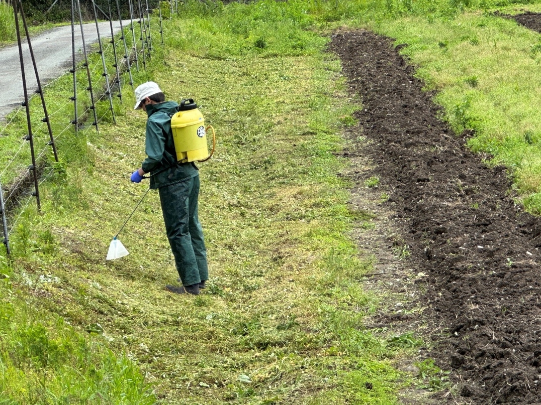 しかし、作物にかかってしまうと作物が枯れてしまうので、風向きを読んだり、飛び散らないよう地面近くで散布したりと、細心の注意を払いました。