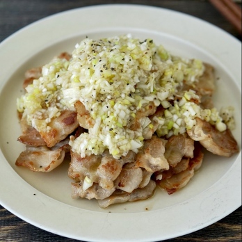 豚バラ肉にたっぷりのネギ塩レモンをあわせて。純正胡麻油こいくちの力強い風味とさっぱりのネギ塩レモンとよく合います。