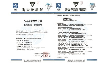 さらに、2000年以降では集団⾷中毒事件やBSE問題、⾷品偽装や消費期限偽装など⾷品業界のモラル低下が社会問題に発展します。九鬼産業では「安全・安⼼・⾼品質」をより確実にするため、2008年2⽉に⾷品安全マネジメントシステムの国際規格「ISO22000」を取得。原材料受け⼊れから商品の納品に⾄るまで、各⼯程の安全⾯を徹底するシステムの運⽤を開始します。ごま加⼯業界においては同認証を取得したのは九⻤産業が初めてです。2012年、さらなる安定供給を⽬指しISO22000にPAS220(⼀般衛⽣管理を強化したガイドライン)を組み込んだFSSC22000を取得。2017年には日本発の食品安全管理規格であるJFS-C認証も取得しています。